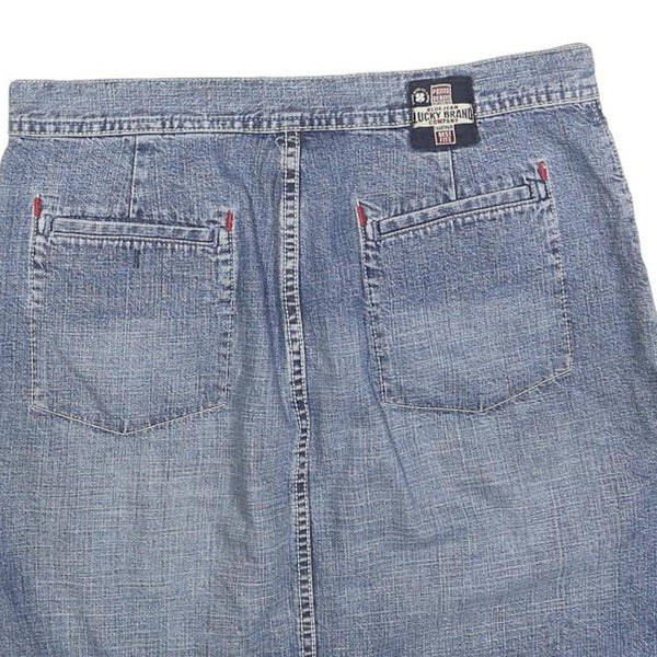 This Lucky Brand womens skirt is crafted from a cotton blend denim fabric in a classic blue wash. It features a mini length with a straight cut, front zip closure, and distinctive front and back pockets accented with subtle red stitching. The front pockets have an inset detail while the back pockets are simple and add to the casual, utilitarian look of the skirt.