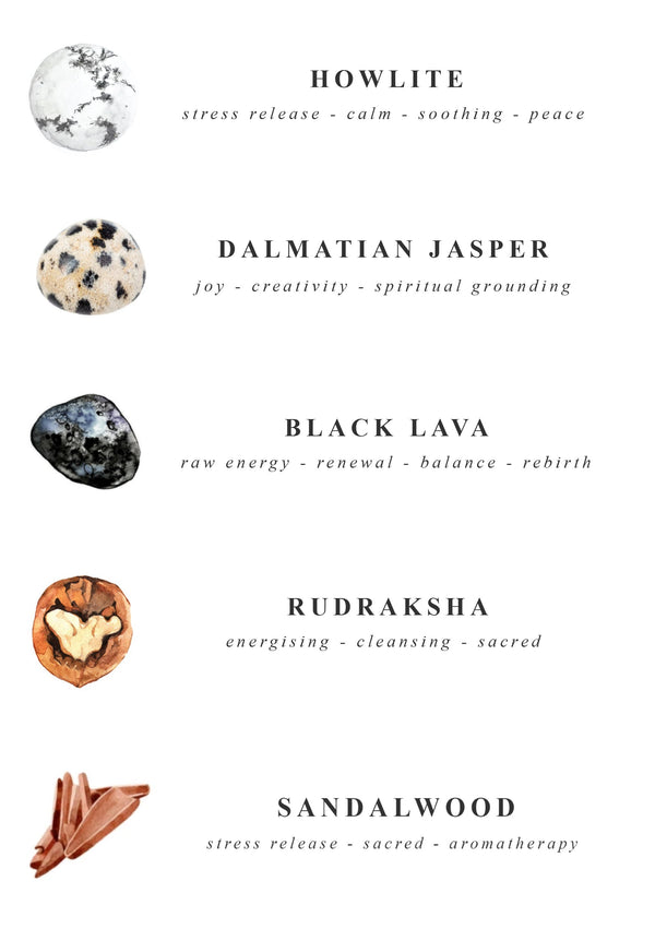 Howlite - Black Lava - Dalmatian Jasper - Sandalwood - Rudraksha