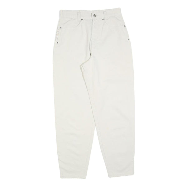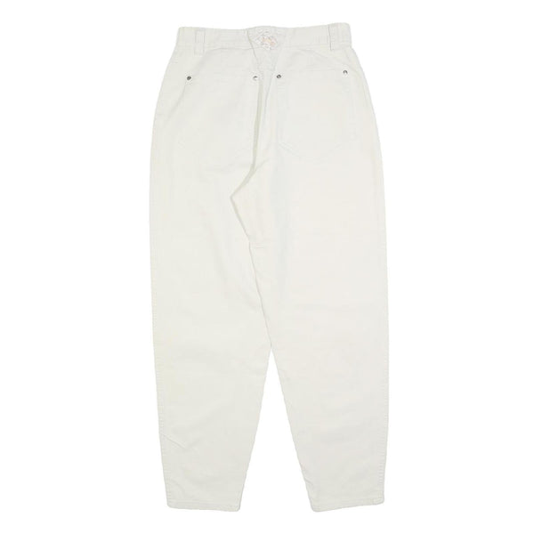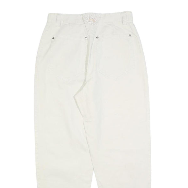 Designed with practical elements, they include secure zip closure and multiple pockets enhanced by subtle metallic rivet detailing. The crisp white shade and simple styling make these trousers an excellent choice for casual or smart casual wardrobe staples.