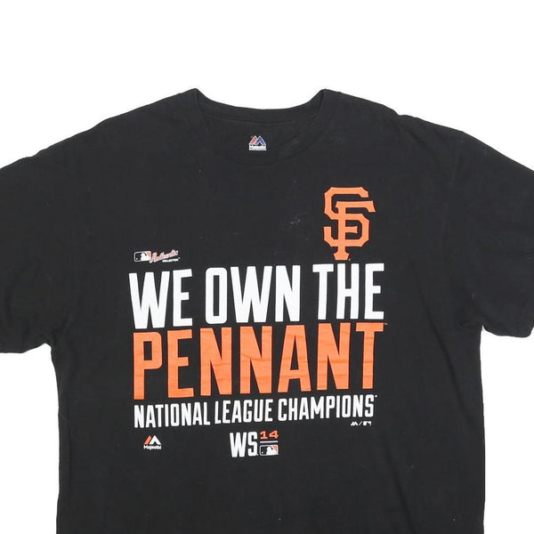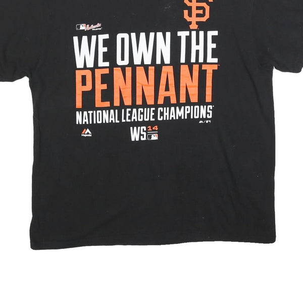 This Majestic Mens T-Shirt features a bold black colour with prominent graphic text on the front reading "WE OWN THE PENNANT" in white and orange lettering, along with "NATIONAL LEAGUE CHAMPIONS" and a symbol denoting WS 14. The iconic "SF" logo appears in orange on the upper left chest, representing the San Francisco Giants baseball team. The design also includes branding elements such as the Majestic logo and the MLB insignia.