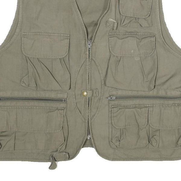 This mens cotton blend utility vest comes in a muted green colour, featuring multiple front pockets with flaps and zip closures for practical storage. The vest has a zip fastening with an additional buttoned strap for secure closure. The design is sleeveless with a simple round neckline, suitable for layering.