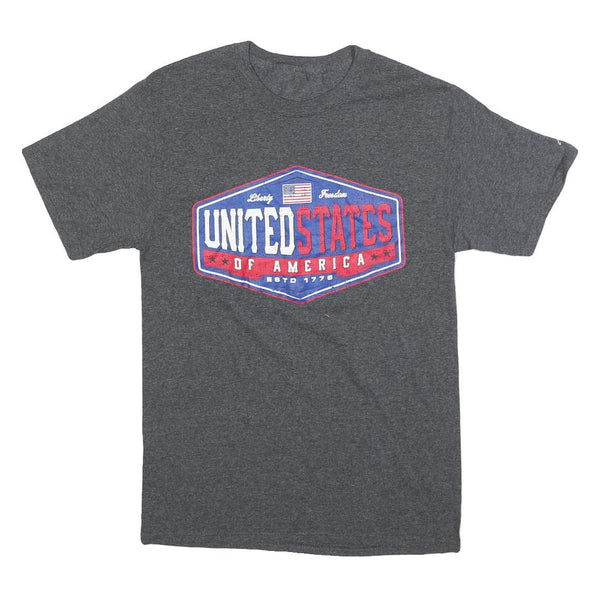 This men's grey T-shirt features a prominent graphic on the front centre with the words "United States of America" in bold red and white lettering set inside a blue hexagonal badge alongside a small American flag and the phrases "Liberty" and "Freedom". The T-shirt has a casual, classic fit with a standard length perfect for everyday wear.
