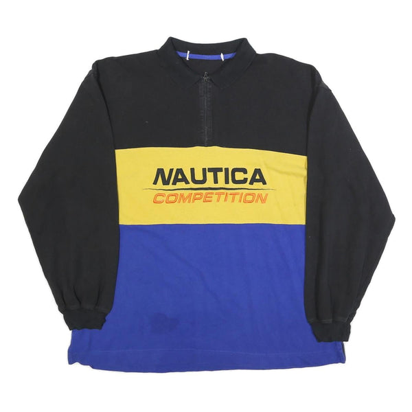 This Nautica mens polo shirt features a bold colourblock design in black, yellow, and blue, with a striking "NAUTICA COMPETITION" embroidered logo across the yellow chest band. The long sleeves have ribbed cuffs adding to the classic sporty look. It has a neat zip fastening at the neckline beneath a traditional point collar.