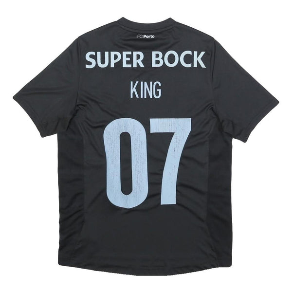 This New Balance mens football shirt is black featuring subtle lighter black accents on the sides. The front showcases the New Balance logo on the right chest and a detailed embroidered FC Porto crest on the left. A large MEO sponsor logo in light blue spans the centre front, accompanied by scattered star motifs. The back prints "SUPER BOCK KING 07" and the FC Porto name in matching light blue near the neckline.