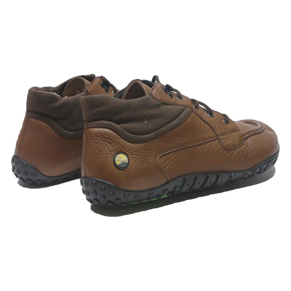 These Nimble Toes men's ankle boots feature a rich brown leather upper combined with darker brown padded suede collar detailing for added comfort and style. The boots have a classic lace-up design with durable eyelets and a textured sole with grip-enhancing studs for superior traction.