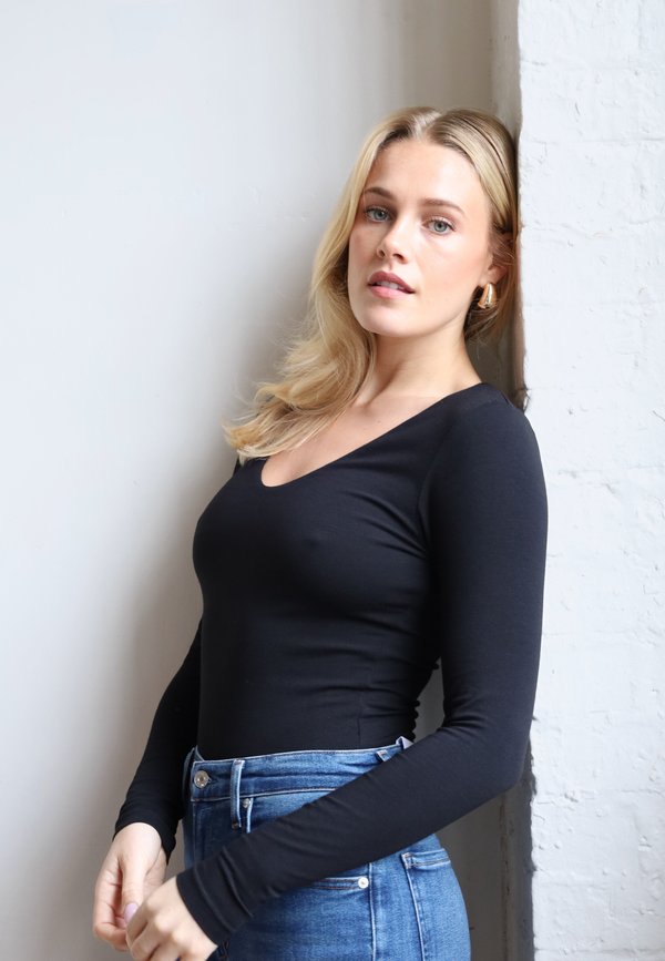 Organic Cotton V-Neck Long Sleeve T-Shirt, Black