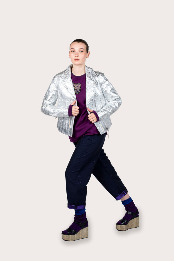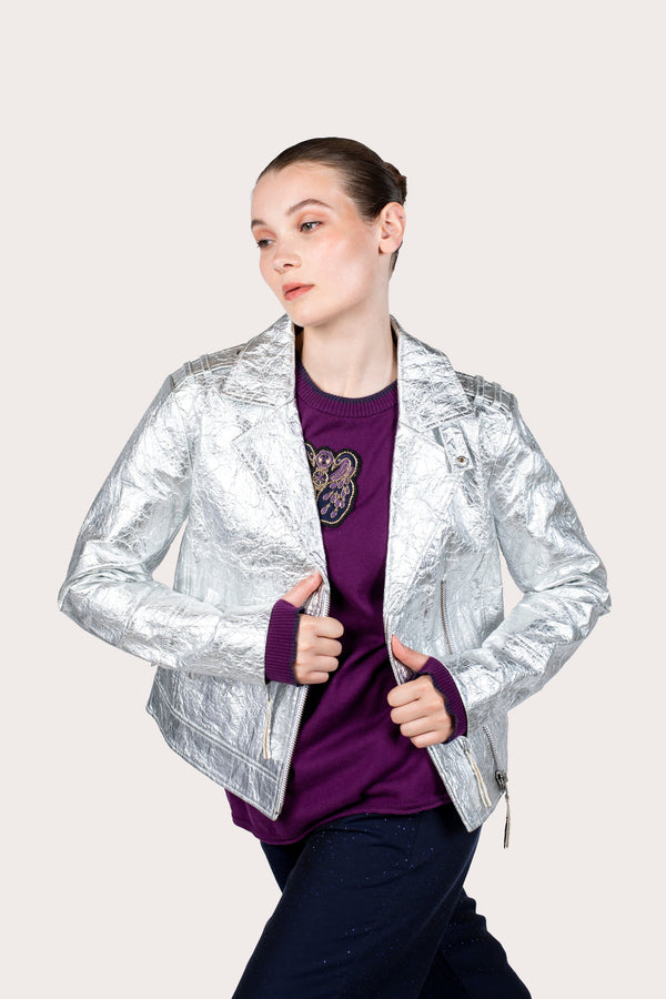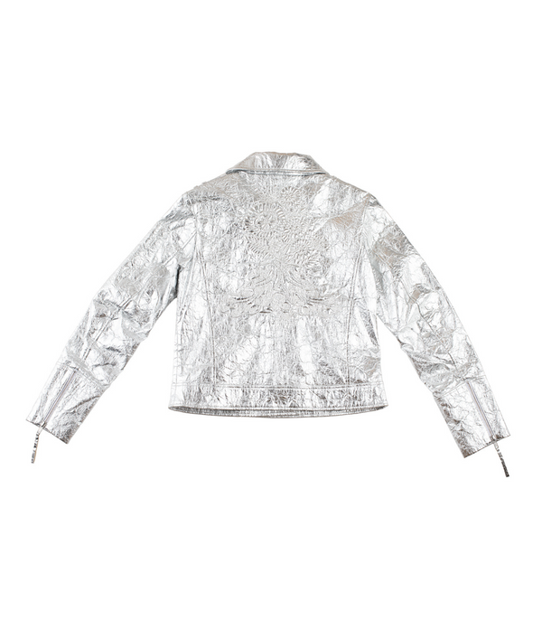 The Ananas Silver Perfecto is created from organic pineapple leaf fiber, a vegan and sustainable material with a leather look. This iconic jacket comes in an exclusive metallic and silver colorway. The iconic embroidery representing flowers and peacocks is embossed on the back of the jacket.