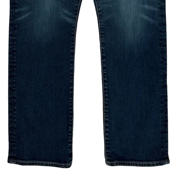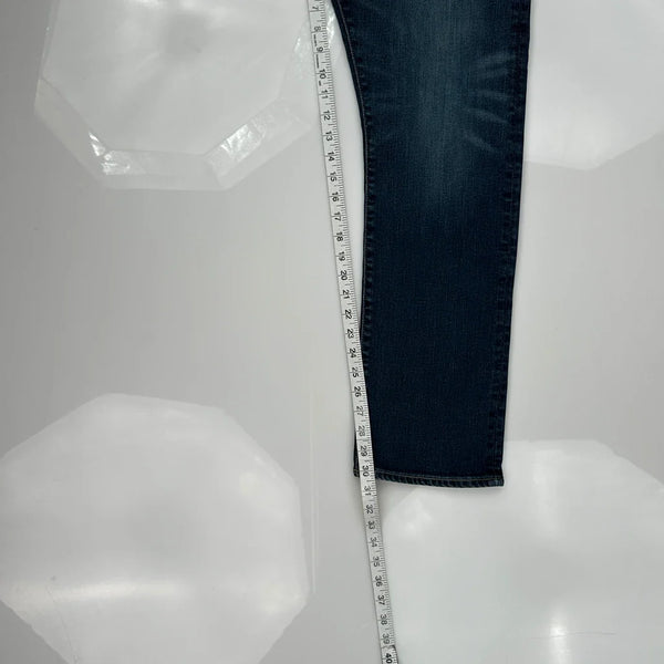 Classic Dark Wash Jeans With Slight Fading On The Thighs.