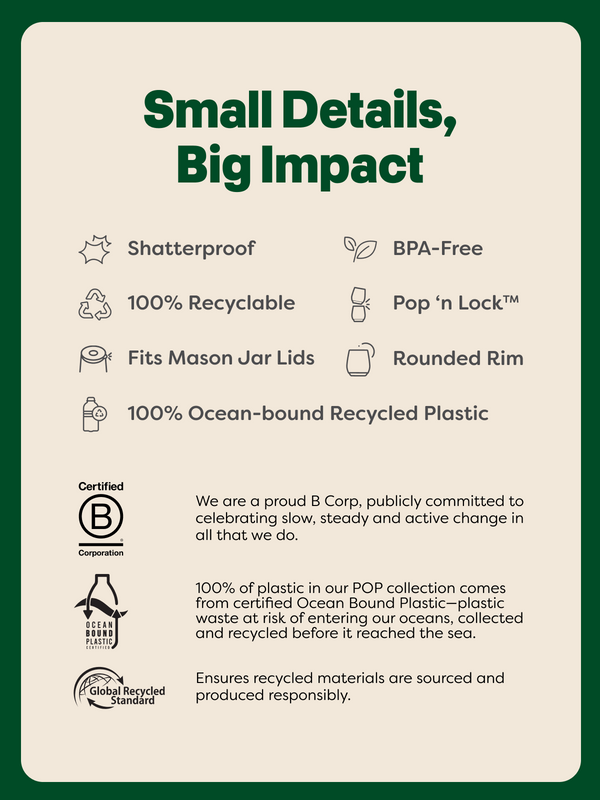 Whether you're spiking the sweet tea or not, this is the porch-swing sipper you'll want with you on a hot day. Pairs adorably with striped straws too. Fits regular mason jar lids. Made with up to one post-consumer bottle per cup and is ♻️ #1 (curbside recyclable).