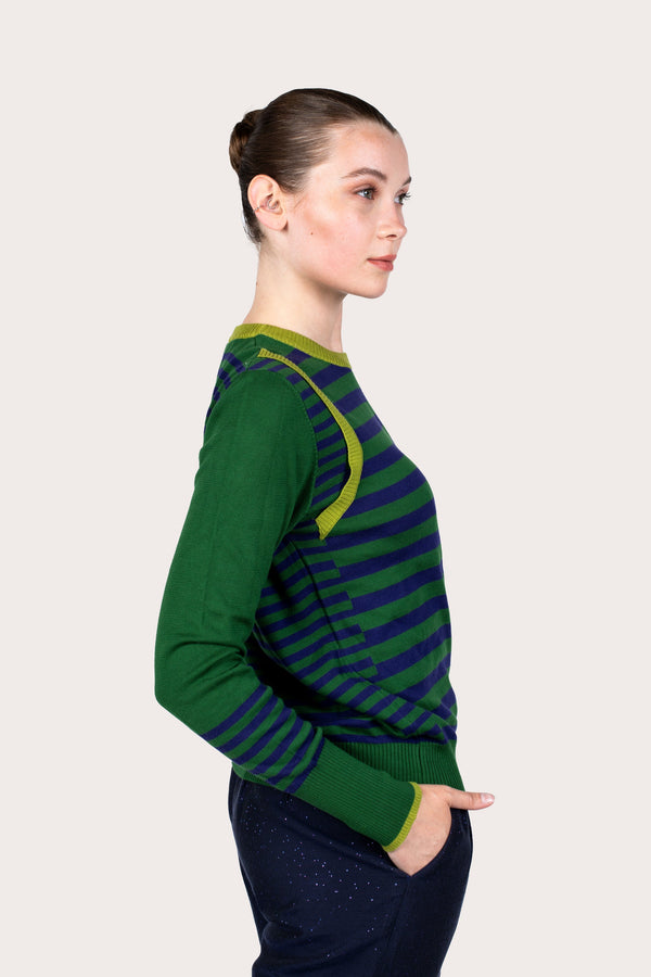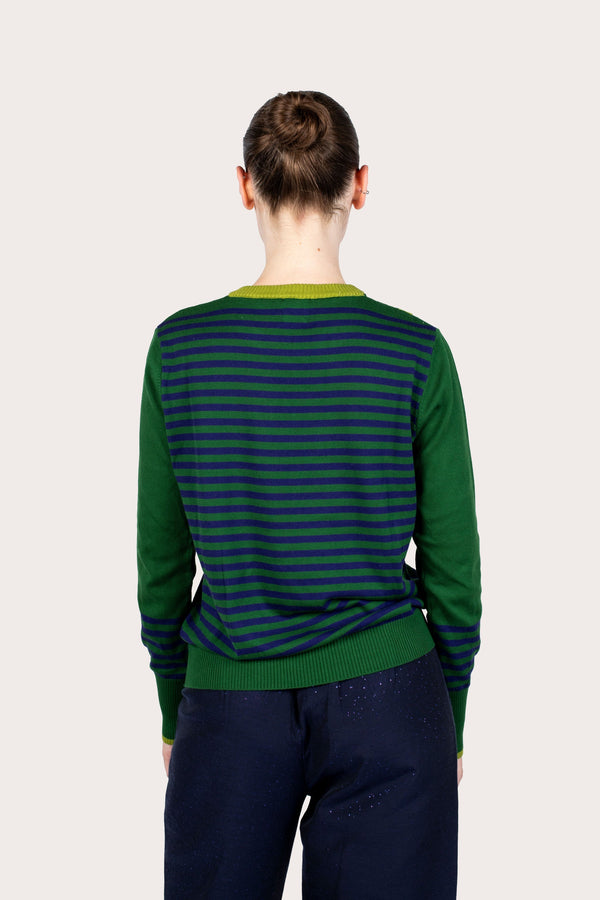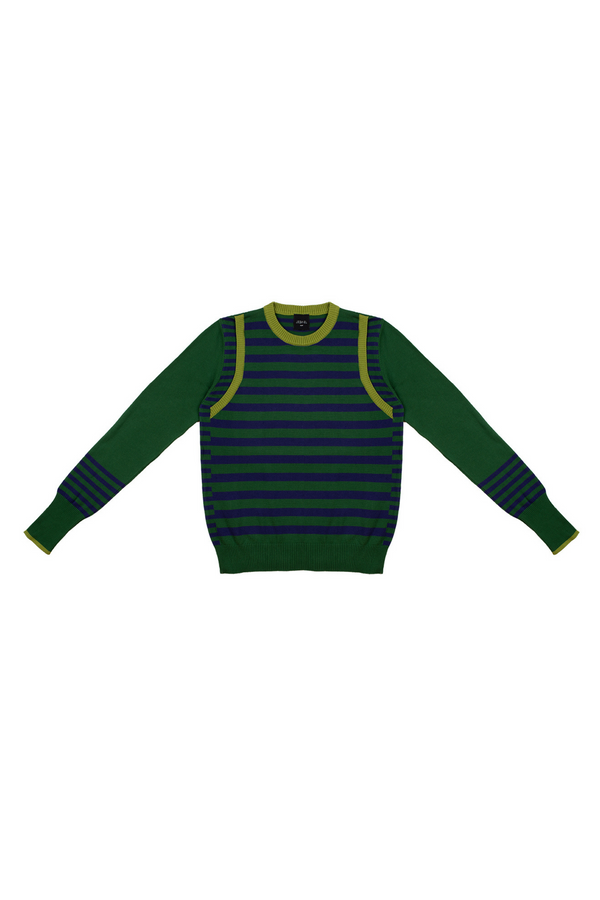 The Fred Green Sweater, an eco-responsible reinterpretation of the French striped sweater, is adorned with two tones of green. This unisex piece, made in Italy , perfectly embodies the idea that ethical fashion can be both modern and environmentally friendly.