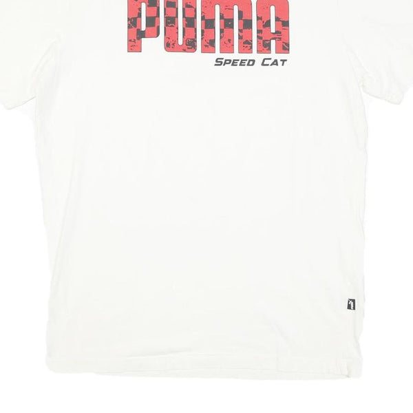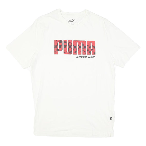 This PUMA mens T-shirt is crafted from a comfortable cotton blend fabric, showcasing a soft white colour as its base. The front features a bold red graphic print with the large text 'PUMA' in a distressed print style overlaying a checkered pattern, accompanied by the smaller text 'Speed Cat' beneath it, creating a sporty yet modern look. The back of the shirt is plain white, ensuring versatility in styling.