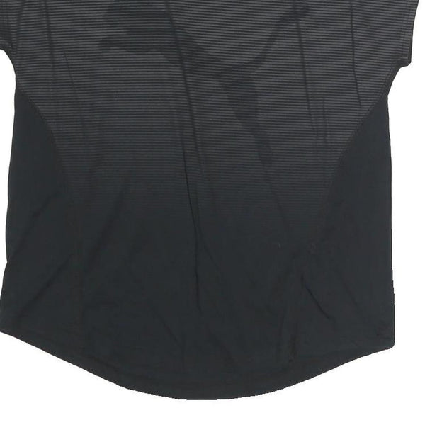 This PUMA womens T-shirt features a sleek black design with a subtle tonal stripe detail across the front panel. The front also displays a large, faint PUMA cat logo that blends seamlessly into the fabric, adding a sporty and stylish element without overpowering the look. The back is plain black with a small white PUMA logo at the nape.