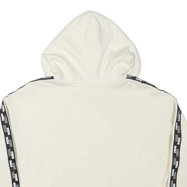 This PUMA womens hoodie features a clean cream colour throughout, accented with black Puma logo tape running down the outer length of the sleeves. The front chest bears a small black Puma logo print on the left side. It has a relaxed fit with a cropped length, offering a modern sporty aesthetic.
