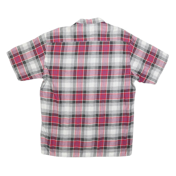 This Men's shirt by RACING features a vibrant check pattern in red, grey, white and black hues. The shirt has a traditional point collar and short sleeves, with two front flap pockets secured by buttons, adding both style and functionality.