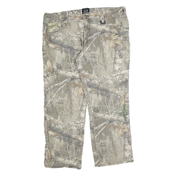 These REAL TREE mens trousers feature a detailed camouflage pattern blending earthy tones of beige, green, and brown with natural forest elements like branches and leaves. The RealTree logo marks the fabric subtly throughout the print. Made from a durable cotton blend, they provide comfort and breathability suitable for outdoor activities. The trousers have a regular fit with straight legs, designed for ease of movement and versatility.