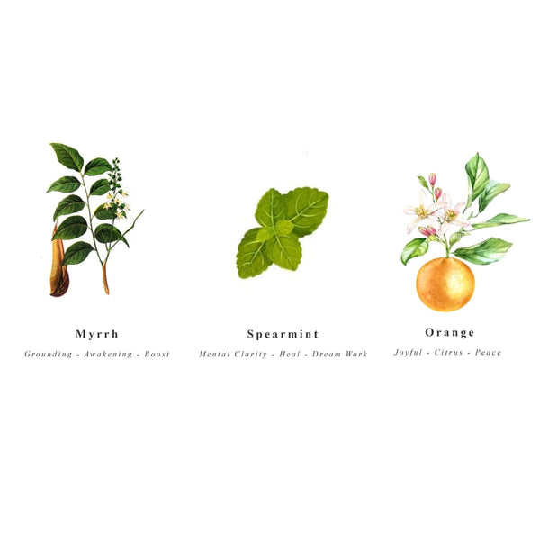 Immerse your senses with beautiful elements of Organic Sage, Eucalyptus, Cedar and Palo Santo, to curate your ritual space with pure joy! Spearmint to lift your mood, orange to ease and attract and Myrrh to ground your base, opening your energy lines up to accepting positivity and joy!