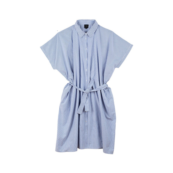 The blue Glam dress is made from GOTS certified organic cotton, just like its belt/top. This LO NEEL creation has an oversized cut and has a mid-calf length. This piece is decorated with a belt and side pockets and a hand-embroidered collar.