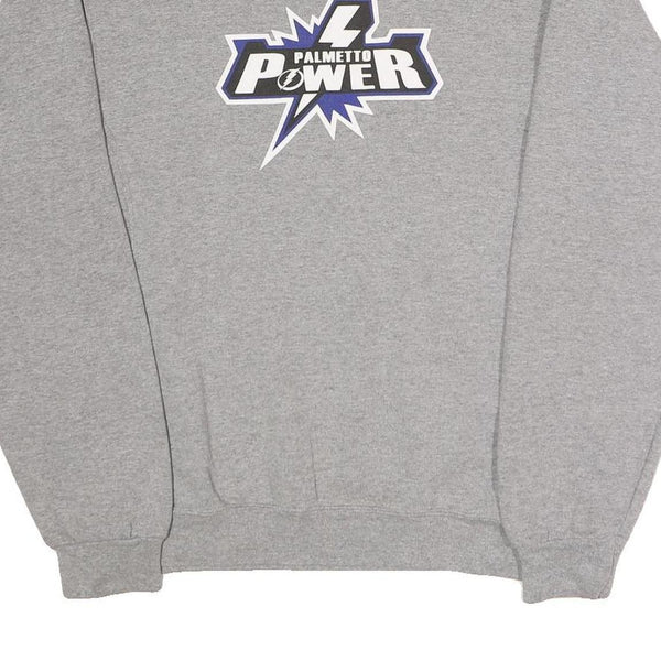 This men's sweatshirt features a comfortable grey colour with a bold "Palmetto Power" graphic print on the front in black and blue with white accents, centred around a lightning bolt design. The rear displays a large blue number "3" outlined in black, adding a sporty touch. The design is iconic and visually striking without referencing any specific sports team or event.