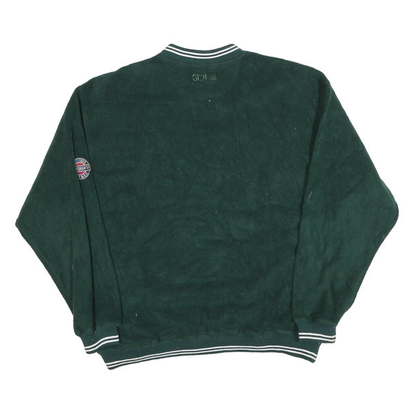 This SDI jumper features a deep green colour with a plain design, augmented by contrasting white stripes on the ribbed crew neckline, cuffs, and hem. The jumper includes a small circular embroidered patch on the left sleeve referencing "1968" and a small neck logo embroidered on the back. It has a classic, relaxed fit and long sleeves.