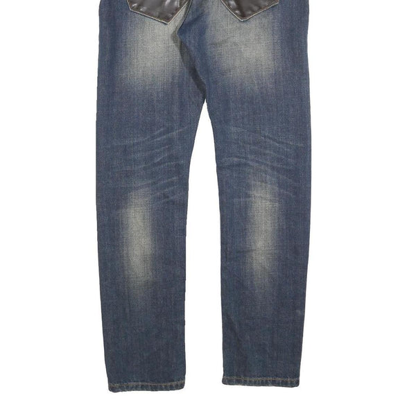 SMK Mens Slim Blue Denim Jeans W32 L32 Stylish Distressed with Leather Detail
