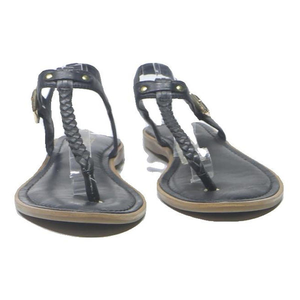 These SPERRY Womens sandals feature a sleek black leather construction with a braided T-strap design and an adjustable ankle buckle in gold-tone metal. The footbed is cushioned for added comfort, ideal for warm weather wear. The sole has a slim profile with a slight heel for a subtle lift.