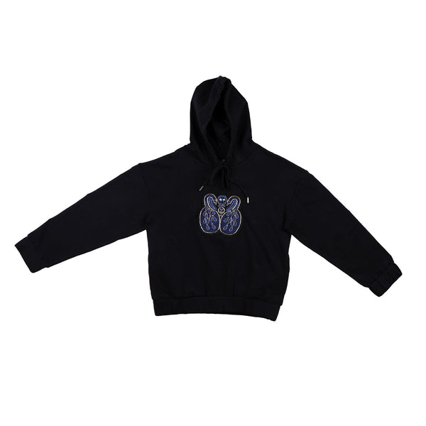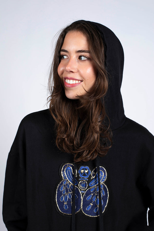 The Colette Black Sweatshirt is a unisex, soft, and pleasant creation that can be worn during all seasons. The selected organic cotton is of exceptional quality so that your sweatshirt will dress you for years. The peacock embroidery is done by hand. The sweatshirt has side pockets and a deep hood.