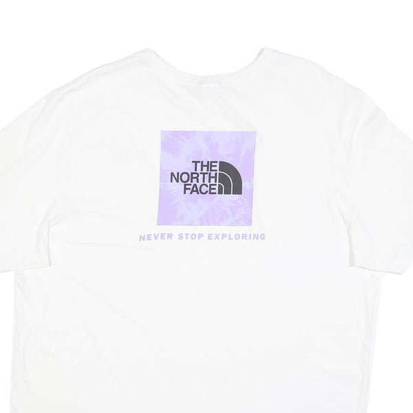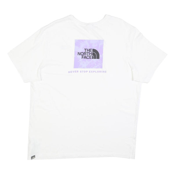 This mens white T-shirt by THE NORTH FACE features a clean and crisp look with a small black logo printed on the front chest. On the back, there is a large purple tie-dye styled square graphic with the brand logo and the phrase 'Never Stop Exploring' beneath it in matching purple text. The classic crew neckline and short sleeves provide a casual and comfortable fit.