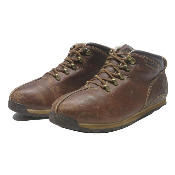 These Timberland boys' boots are crafted from durable brown leather, designed to offer comfort and protection for outdoor activities. The boots feature soft padded collars for ankle support, a classic lace-up fastening with metal eyelets, and the iconic Timberland tree logo embossed on the heel. The outer sole is made of rugged rubber providing excellent traction.