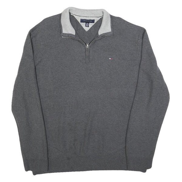 This Tommy Hilfiger jumper is crafted in a solid grey colour with a subtle textured cotton blend fabric, offering both comfort and style. It features a half zip closure with a contrasting lighter grey inner collar, providing a smart yet casual look suitable for various occasions. The iconic Tommy Hilfiger flag logo is embroidered on the chest for authentic branding.
