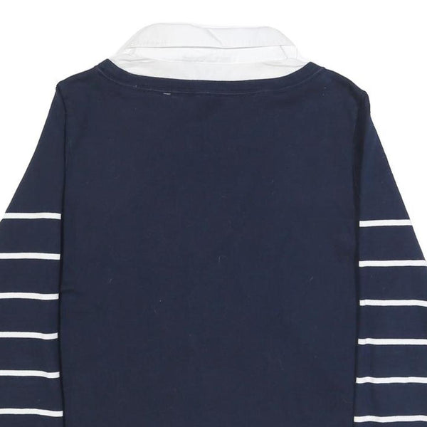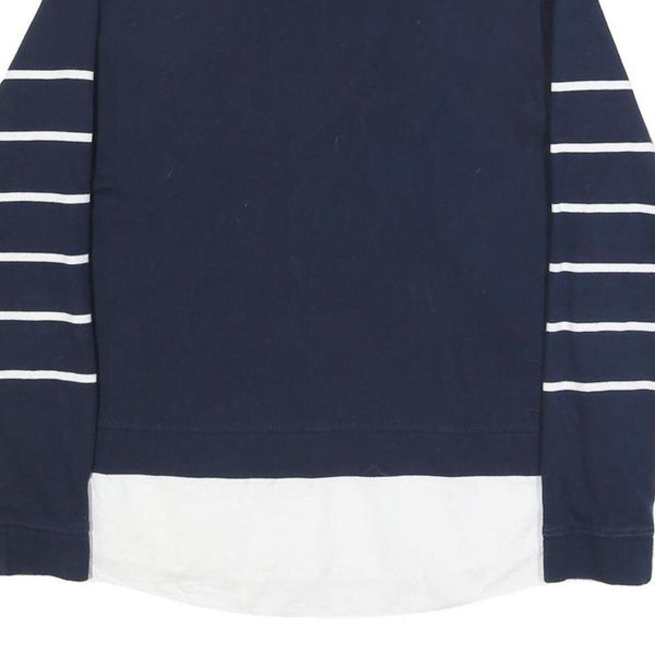 This Tommy Hilfiger womens jumper features a deep navy blue base with white horizontal stripes on the sleeves for a stylish contrast. It has an integrated white shirt collar and bottom hem to create a layered shirt-over-jumper look, adding a smart-casual vibe. The front is plain navy with no additional graphics or visible branding.