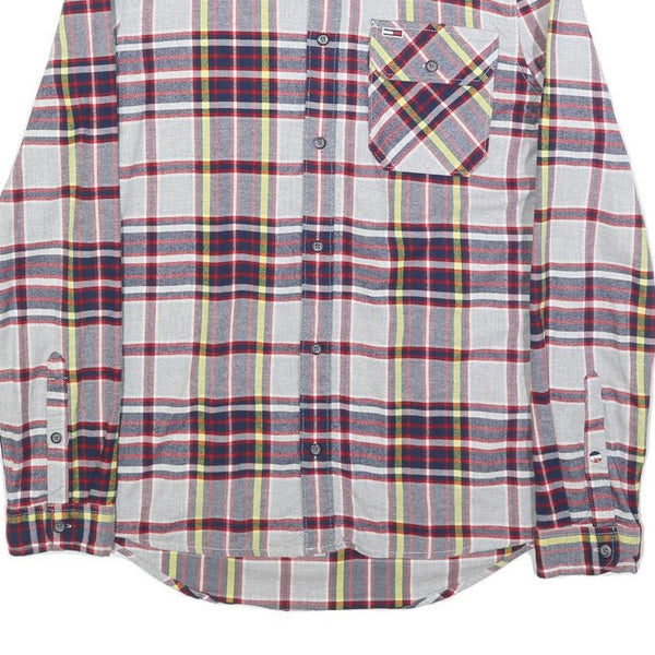 This men's shirt by Tommy Jeans features a classic check pattern in white, navy, red and yellow tones. The design includes a chest pocket with the Tommy Jeans flag branding tag, a button-front closure, and a traditional collar. The check pattern is consistent throughout, including across the pocket and back yoke for a coordinated look.