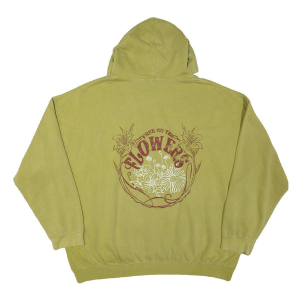 This Urban Outfitters mens hoodie is crafted in a soft cotton blend fabric in a muted green shade. The front features a delicate white floral line drawing at the center chest, offering a subtle yet stylish graphic. The back showcases a larger, vintage-style floral print in white and faded red text that reads 'Free As The Flowers', surrounded by an ornate floral frame.