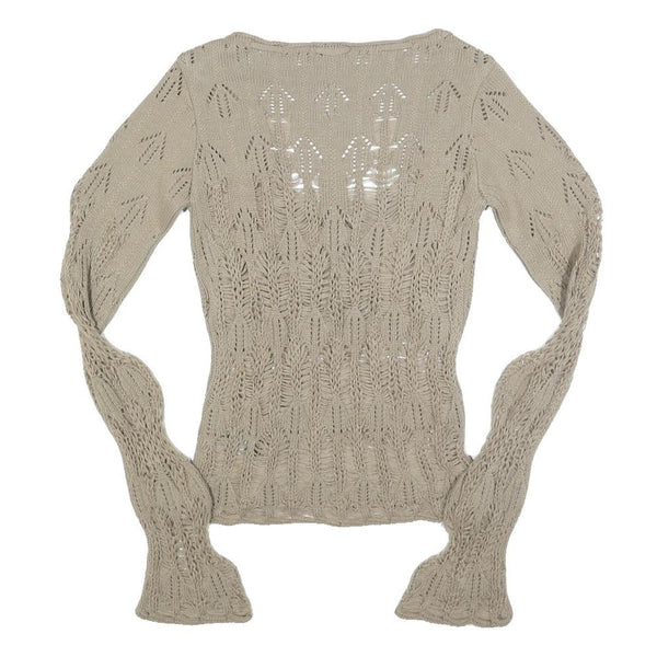 This Urban Outfitters womens jumper features a soft beige colour with an intricate patterned design throughout. The open-knit detailing adds a delicate, breathable texture, making it a standout piece for layering or wearing on its own when the weather is mild. The scoop neckline offers a flattering and comfortable fit.