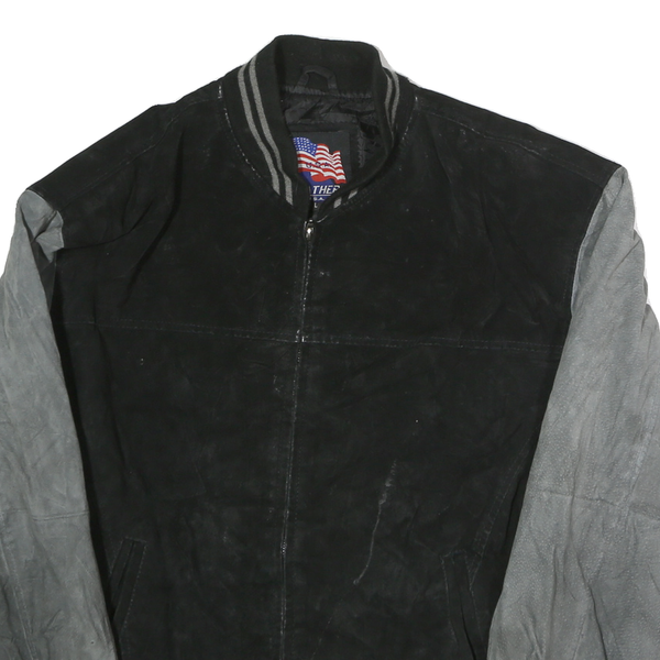 USA LEATHER Mens Black & Grey Leather Bomber Jacket L Suede Varsity Style Zip