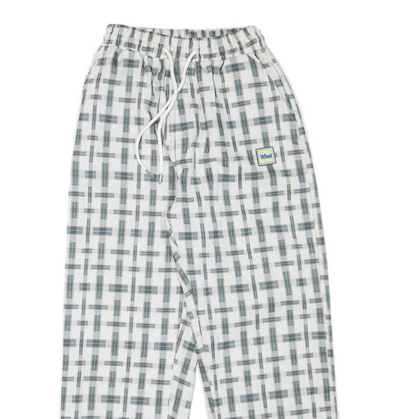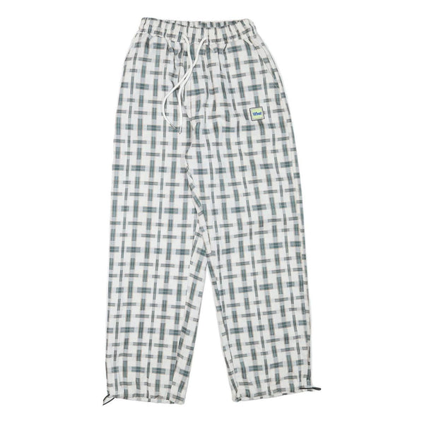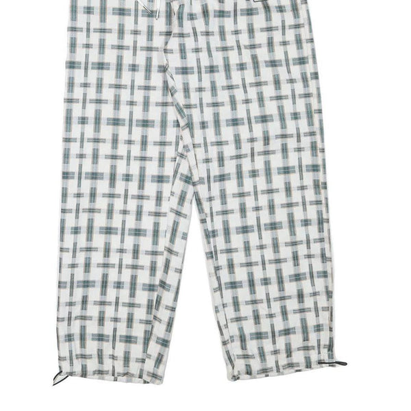 These womens trousers by WHAT feature a distinctive white base with an all-over grey checked pattern, offering a modern and stylish look. The waistband includes a drawstring closure for adjustable fit and adds to the laid-back aesthetic.