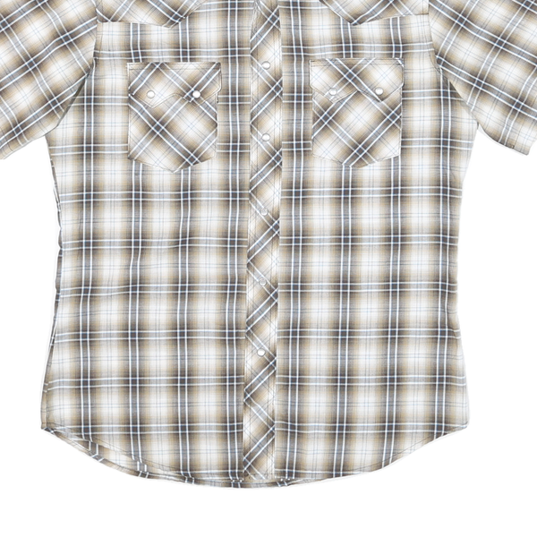 This Woolrich mens shirt features a classic beige and brown plaid pattern with subtle white and black accents, creating a traditional western style. It has a pointed collar and short sleeves, plus two flap chest pockets with snap button closures for added utility and style.