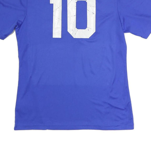 This Adidas mens T-shirt features a vibrant blue colour with classic white Adidas three-stripe detailing along the shoulders and sleeves. The front bears the Adidas logo in white, while the back displays a large white number 10 print, slightly worn with some cracking visible. The shirt has a V-neckline and short sleeves, designed for sporty aesthetics.