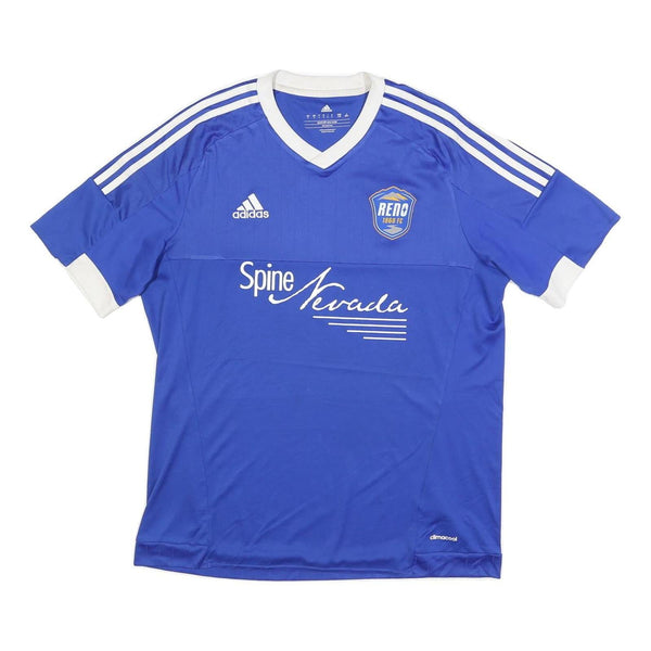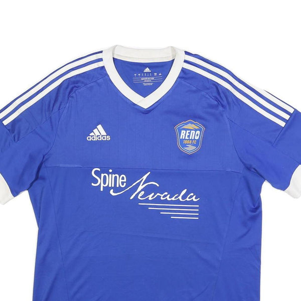This Adidas football shirt features a vibrant blue colour with contrasting white trim on the V-neck collar and sleeve cuffs. The front proudly displays the Reno 1868 FC club crest on the chest alongside the Adidas logo and sponsor text "Spine Nevada" in white. Classic Adidas three-stripes run along the shoulders and sleeves in white, adding sportswear authenticity.