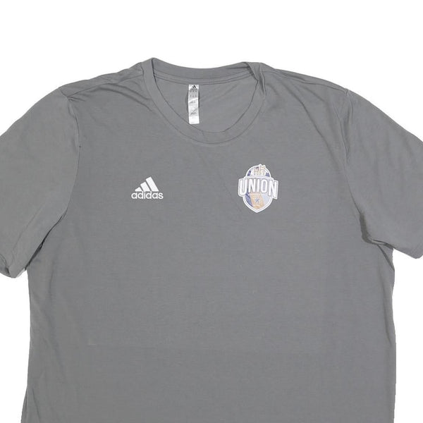 This Adidas mens T-shirt features a solid grey colour with a Union crest graphic on the chest and the Adidas logo in white. It is designed for both casual and athletic wear, blending sporty branding with a clean look. The crew neckline and short sleeves provide a classic summer style.
