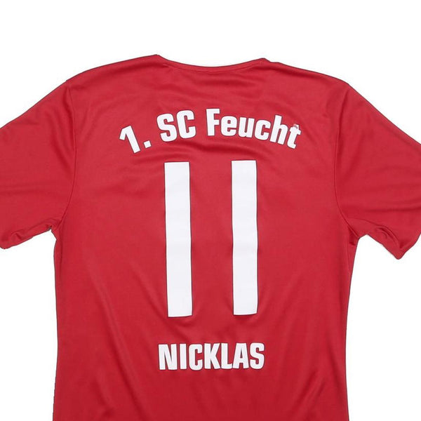 This Adidas Mens T-Shirt showcases a striking red colour complemented by white three stripes down each short sleeve and a white V-neck collar. It features bold graphic prints on the front, including the Adidas logo, Sport Shop Fischbach text, and a circular SPORT 2000 logo. The back displays "1. SC Feucht" above the number 11 and the name "Nicklas" below.