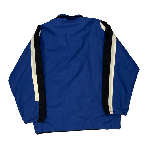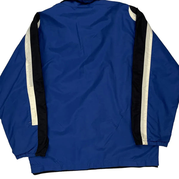 Blue Windbreaker With Black And White Stripes On Sleeves
