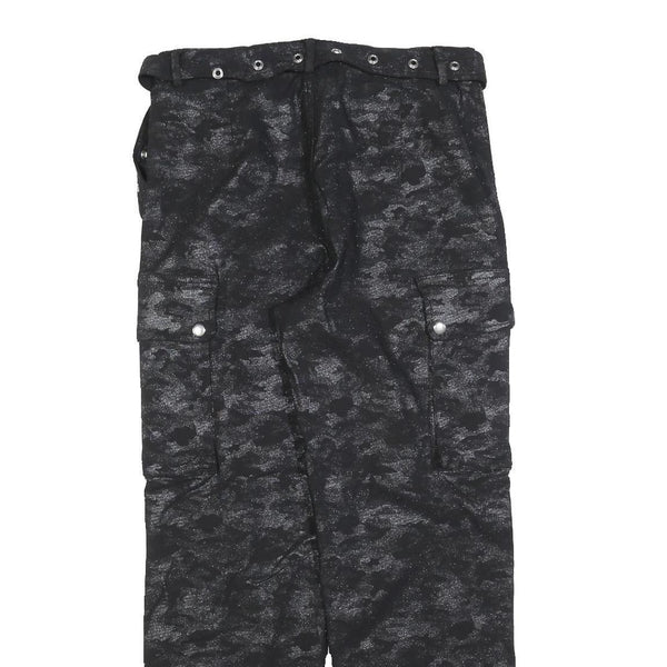 These AKIRA womens cargo trousers feature a stylish black camouflage-inspired print with subtle grey accents creating a textured appearance. The fabric is a comfortable cotton blend, offering a soft yet durable feel suitable for everyday wear. They include a matching fabric belt with metal eyelets and buckle for an adjustable fit.