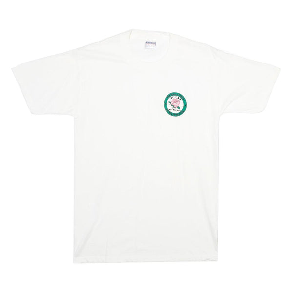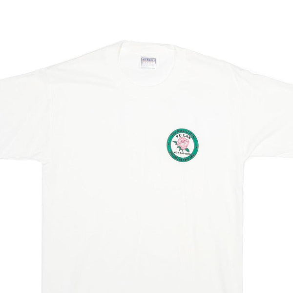 This men's T-shirt by All Sport Events features a clean white colour with a small, circular graphic printed on the left chest area. The graphic includes a pink rose with surrounding green text that reads "The Rose of Mu Lan" and other details, adding a subtle focal point to the minimalist design.