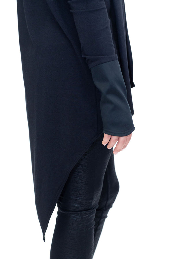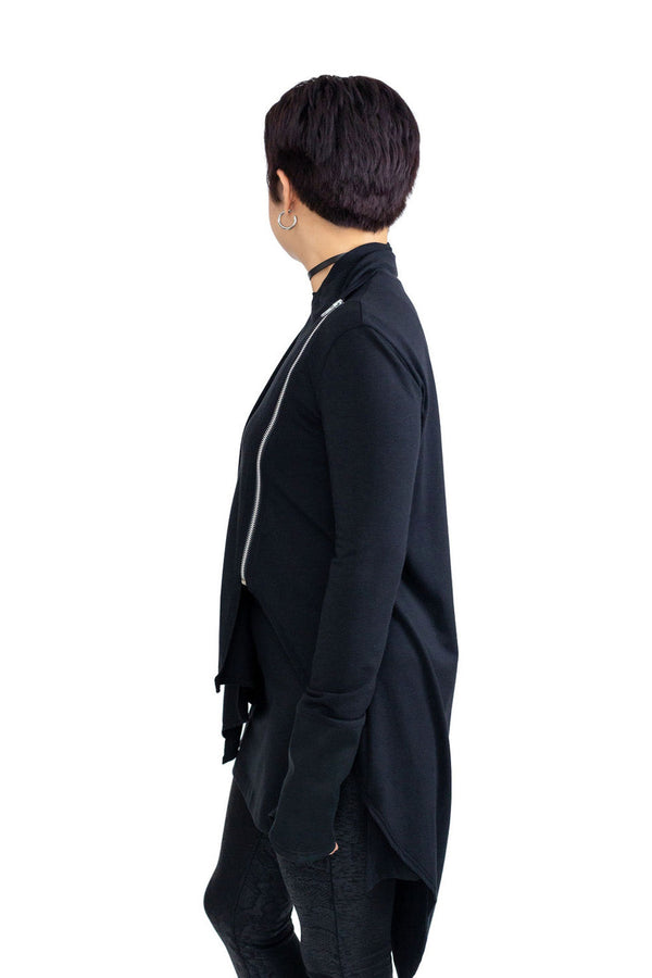 Made from our signature Tencel and organic cotton jersey, this long black jacket has an asymmetrical zipper and hem, plus an attached scarf that can be worn five ways. A Tencel sateen cuff adds shine to the extra-long sleeves, finished at a curve to just cover the knuckles.