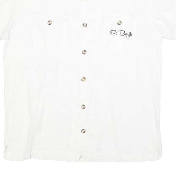 The front showcases two buttoned chest pockets, with the right pocket embroidered with "St Barth FIJI" in stylish black script. Button fastenings run down the front and on the cuffs, adding practicality and a neat finish. The shirt's plain white design with subtle branding makes it versatile for casual outings and summer wear.