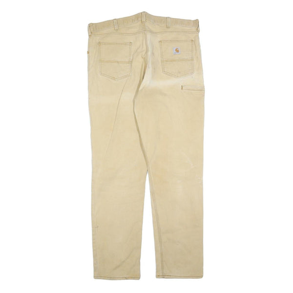These Carhartt mens trousers are crafted from a durable cotton blend in a classic beige colour. They feature a relaxed fit with a zip closure and multiple practical pockets, including a rear patch pocket with Carhartt branding. The trousers show subtle signs of wear and light marks consistent with prior use.