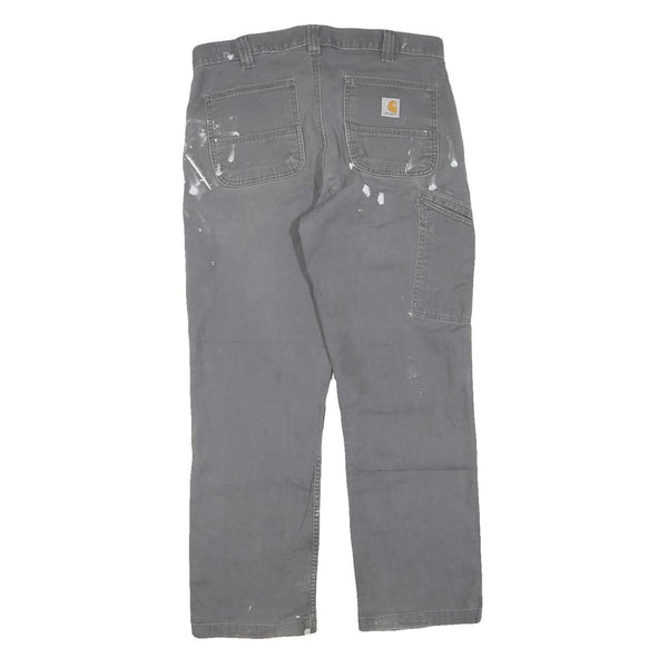 These Carhartt mens trousers come in a solid grey colour with visible white stains and paint marks on the front and back, consistent with workwear use. They feature a relaxed and regular fit with straight-cut legs, designed for comfort and ease of movement. The rear has patch pockets, including one with the Carhartt logo patch sewn on, adding authentic branded detailing.