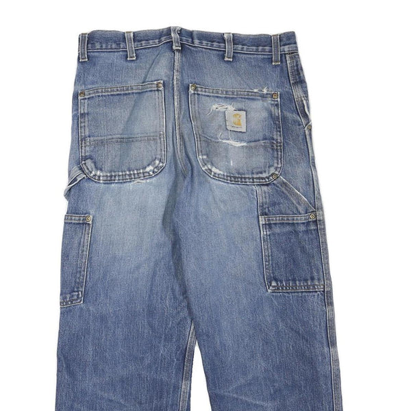 The back features dual patch pockets, one with the Carhartt logo patch and visible wear, enhancing the authentic vintage look. These jeans embody Carhartt's heritage of tough, functional workwear designed to last through heavy use without compromising on comfort.