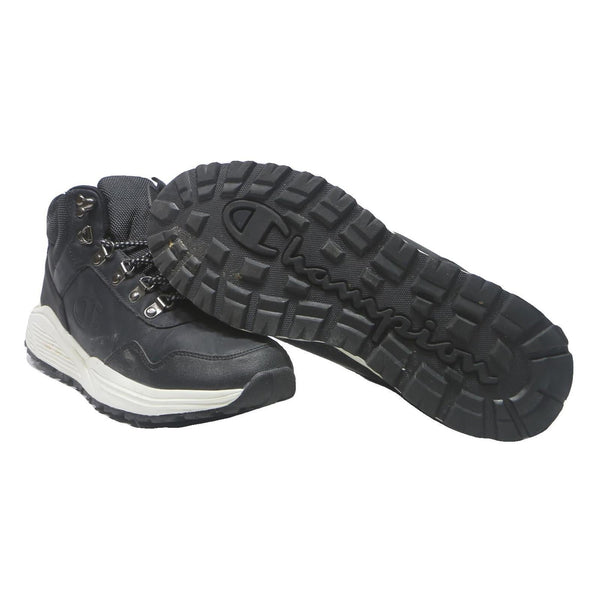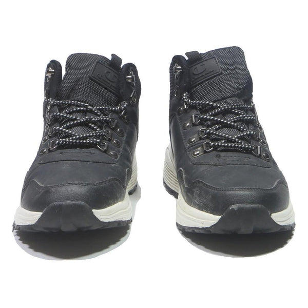These mens trainers by Champion feature a predominantly black synthetic upper with a subtle embossed Champion logo on the outer side panel. They are equipped with metal lace eyelets and robust black and white laces, contributing to a durable and sporty look.