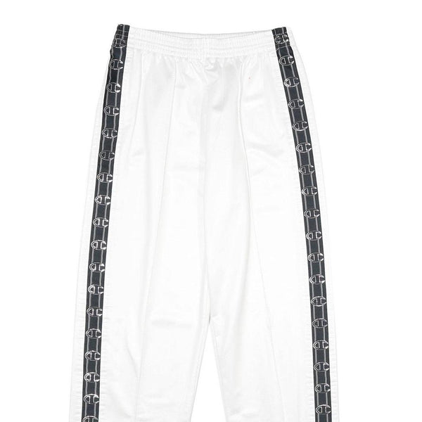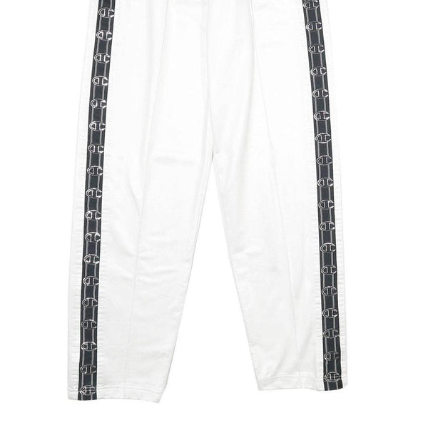 These Champion mens joggers feature a crisp white colour with contrasting black tape running down the sides of the legs, emblazoned with repeated Champion "C" logos. They offer a modern sporty look with clean lines and classic branding that stands out on the side stripes.